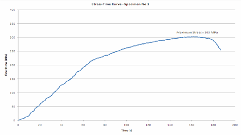- Shear Stress Curve for Sample 1 showing an ultimate shear stress of 303 MPa. Note ductile fracture characteristics from curve.