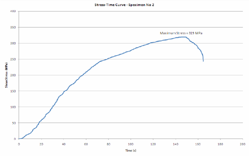 - Shear Stress Curve for Sample 2 showing an ultimate shear stress of 319 MPa. Note ductile fracture characteristics from curve.