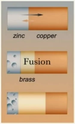 - Across an “intimate” & inclusion-free interface of 2 solid metals; atoms diffuse between each other at different rates, with heat, pressure & time. For example, brass, which is zinc & copper’s alloy, grows in the direction of the faster diffusing species.